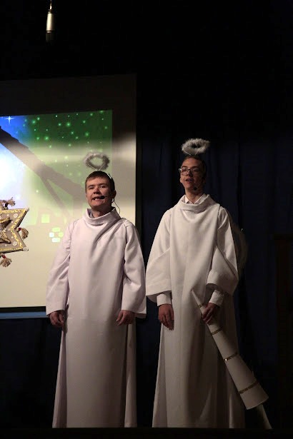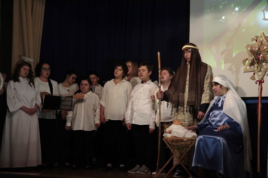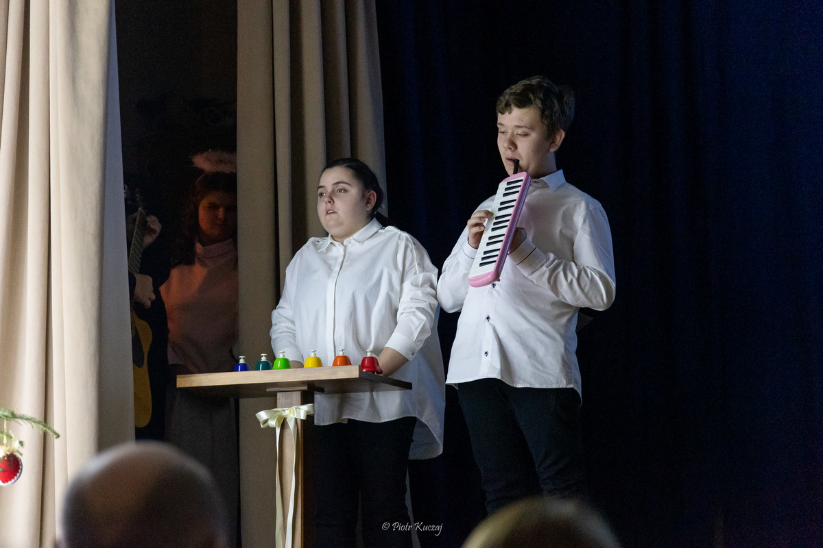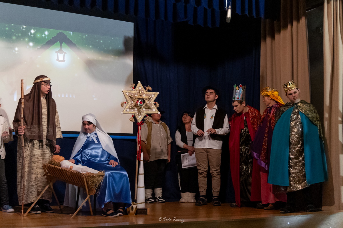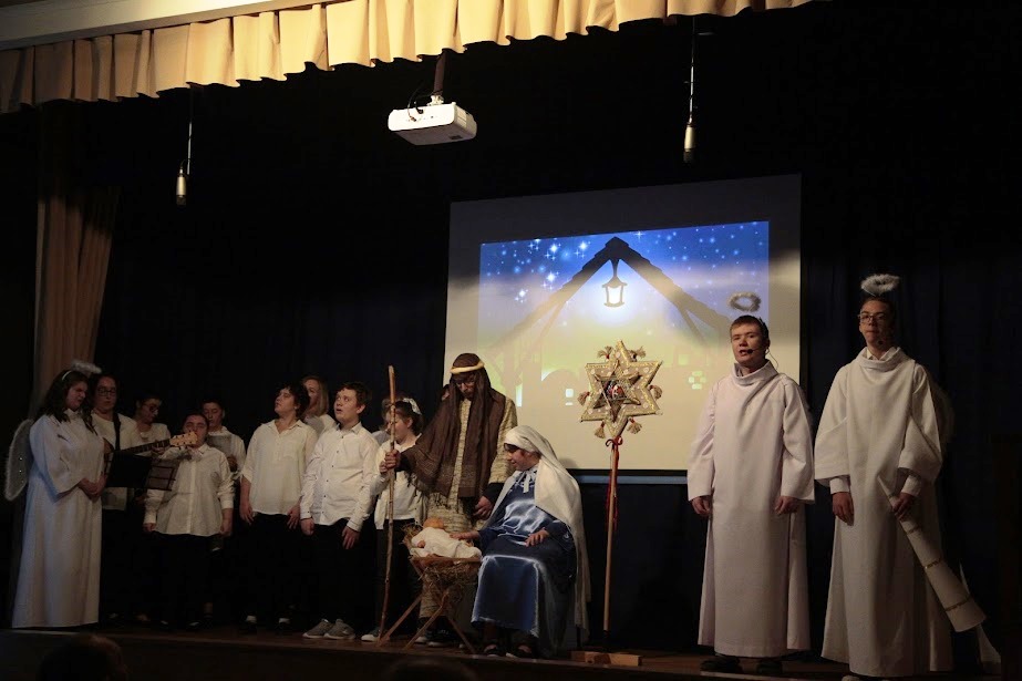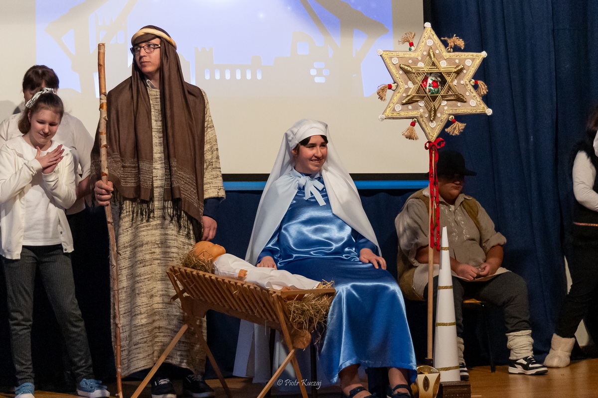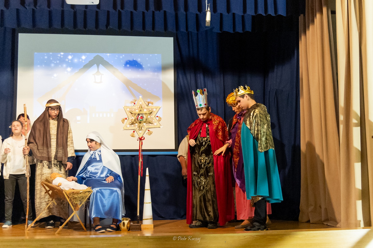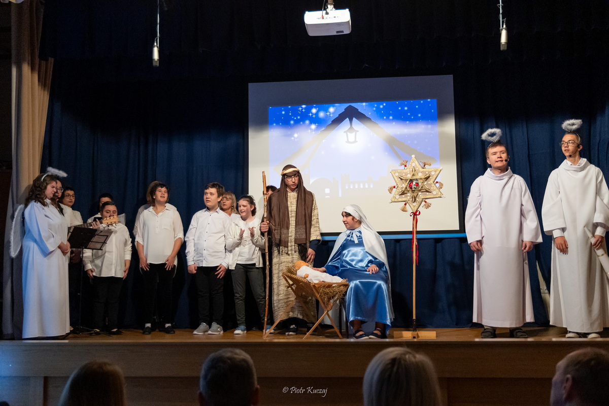 S. Irmina zaprosiła wszystkich Gości na jasełka, przez które pragnęliśmy wyrazić naszą wdzięczność dla wszystkich Gości i Darczyńców za współpracę z Ośrodkiem, za skierowane wsparcie i serce ku naszym uczniom i przekazywane dobro w różnej formie pomocy. Jasełka pt.,,Przyszedł Anioł do stajenki” : scenariusz napisał p. Adam Zięba, a wystąpili w nich wychowankowie Ośrodka wraz z kadrą pedagogiczną. Ta krótka opowieść o Bożym Narodzeniu opowiedziana została przez narratora, który wskazywał na aniołów przejętych wydarzeniem w stajence. Anioły chcąc wypełnić chwałą stajenkę zapraszały kolejno do stajenki chór aniołów, pasterzy i Trzech Króli. Na końcu zwróciły się do wszystkich zgromadzonych, aby również dołączyli i przybyli z darami ofiarować swoje dobre czyny i przebaczenie bliźnim. W pastorałce finałowej wybrzmiał wspólny śpiew Gloria in Excelsis Deo! Po jasełkach wszyscy połamali się opłatkiem, następnie był poczęstunek i wspólne kolędowanie.