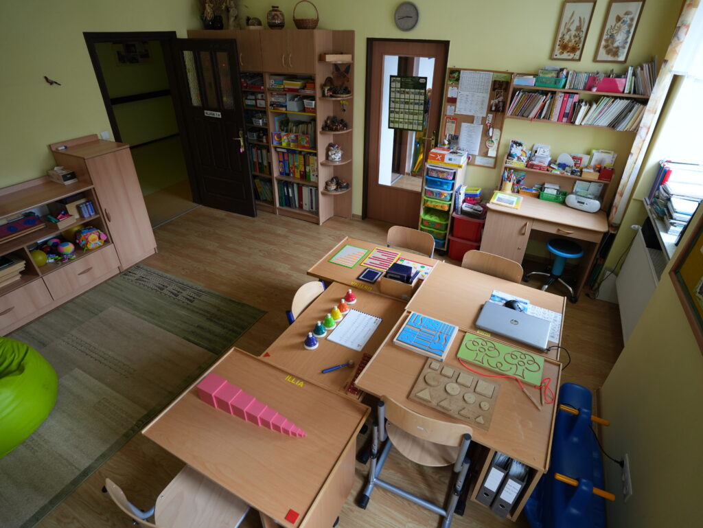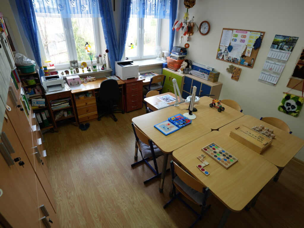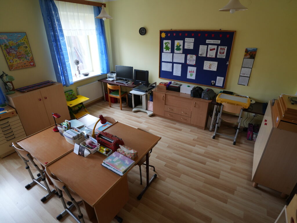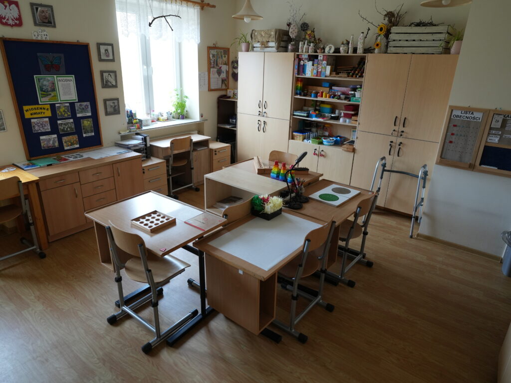 • Przestronne sale lekcyjne z regulowanymi stołami i krzesłami, bogato wyposażone w materiały wspierające rozwój umiejętności praktycznych i społecznych, w tym sprzęt multimedialny, materiały plastyczne, narzędzia i przybory do różnorodnych technik artystycznych.