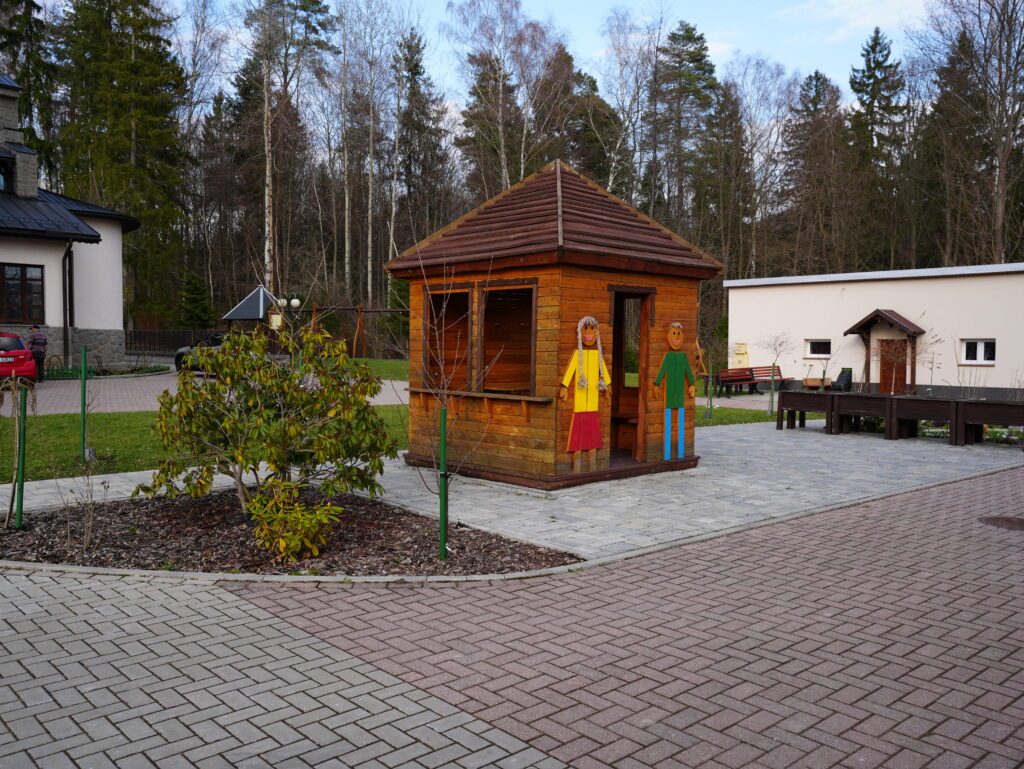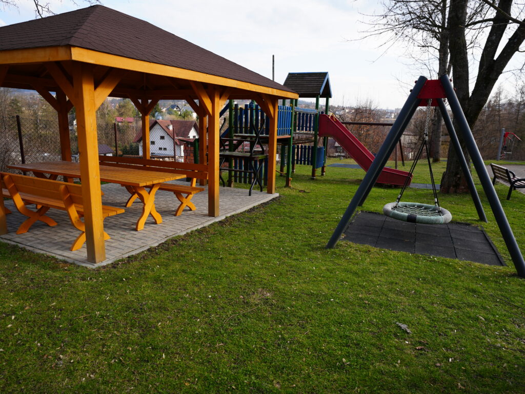 • Strefa relaksu na świeżym powietrzu z ławkami, altaną i miejscem na zajęcia plenerowe.